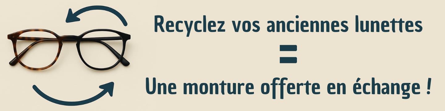 Dans le cadre de notre programme de recyclage, nous reprenons vos anciennes lunettes, qu'elles soient en bon état ou non.