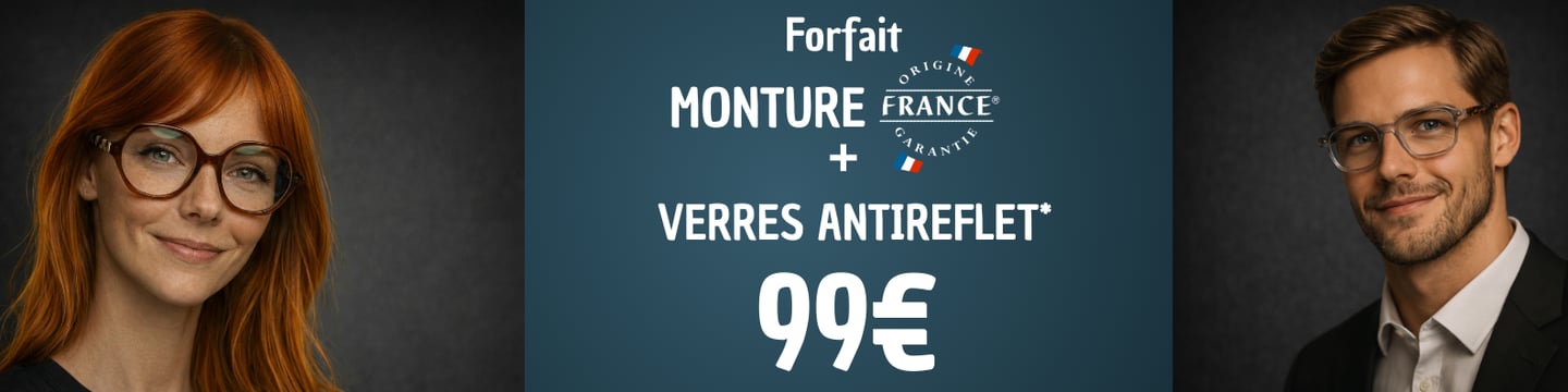 Prix de vente TTC conseillé en magasin pour une monture OWLET (sélection de montures présentées en magasin d’un prix maximum de 30€) + 2 verres unifocaux standard 1.5 solaires ou verres unifocaux organiques 1.5 solaires non durcis, corrections -5/+5, cylindre +2 (sphère + cylindre ≤ +5). Options possibles avec supplément de prix. Offre non cumulable avec tout autre forfait, offre 2ème paire, promotion ou avantage en cours. Offre valable jusqu’au 31/12/2026.