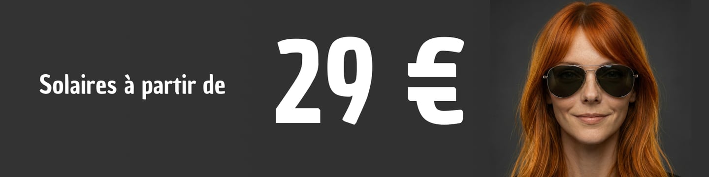 Découvrez notre collection de lunettes de soleil à partir de 29 €, alliant style, confort et protection. Nos solaires répondent aux normes CE, garantissant une protection optimale contre les rayons UV, pour préserver la santé de vos yeux. Nous proposons un large choix de modèles adaptés à tous les âges et à tous les styles. Visuel non contractuel.