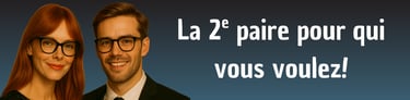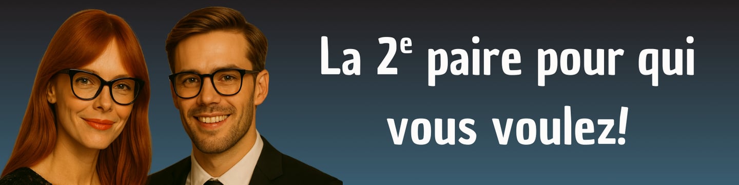 Lorsque la 2ᵉ paire est destinée à un bénéficiaire de son choix (conjoint, enfant, proche), elle est proposée exclusivement avec des verres unifocaux correcteurs durcis dans les mêmes limites de corrections. Une option permettant l’équipement en verres progressifs est possible avec supplément, sous réserve d’ordonnance valide.